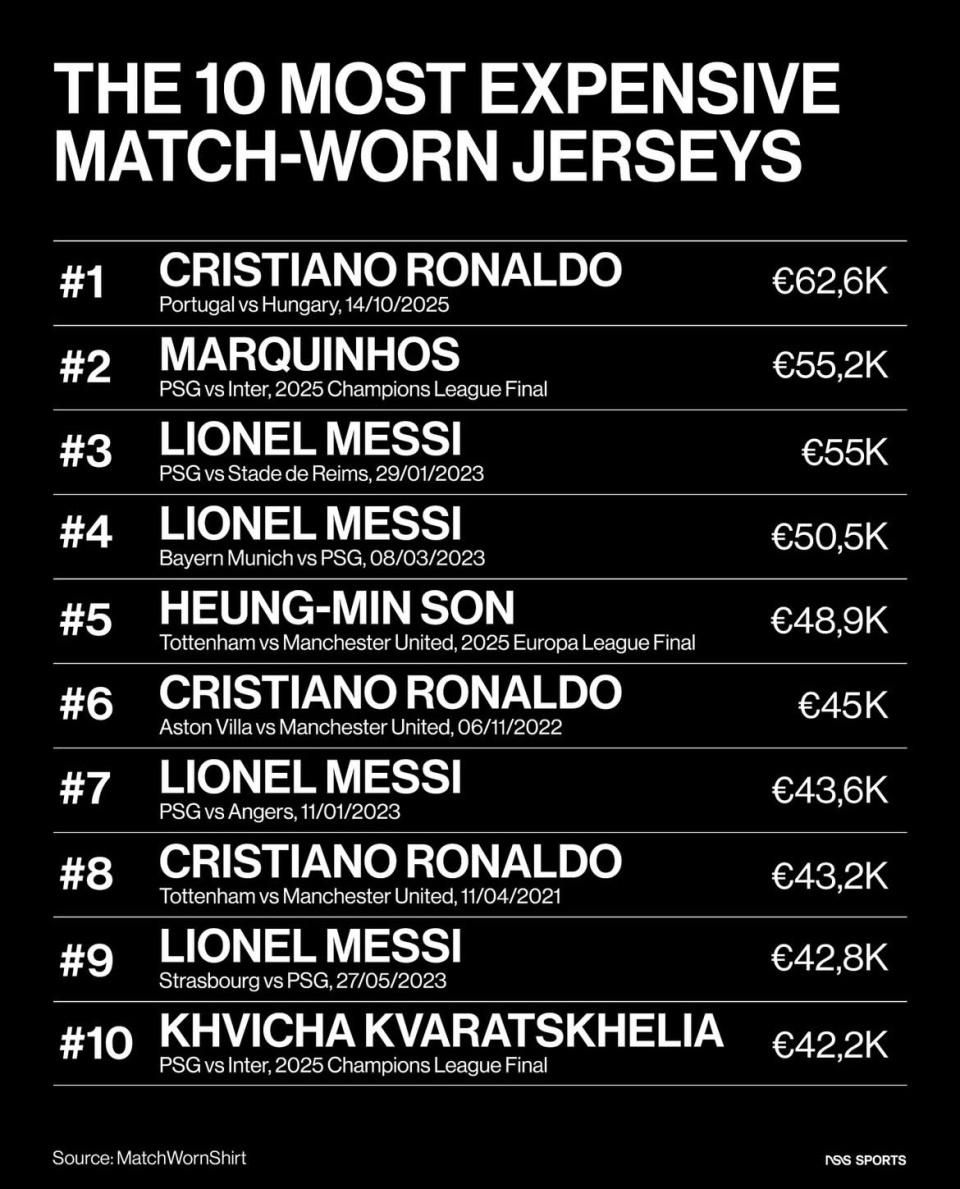 最近Match WornShirt集合NSS Sports发布了一份“历史最贵比赛实战球衣TOP10”榜单,说的不是年薪、不是代言费,而是单件球衣在拍卖平台上的最终成交价。这些球衣皆是真真实致密比赛里穿过的实战战袍,一件就能被炒到几十万欧元,最贵的致使接近63万欧元,上榜的有梅西、C罗、等东谈主。到底是一件球衣自己值这个价,依然被比赛钦慕和球星光环沿途抬上去的,你不错边看名次边我方下判断。