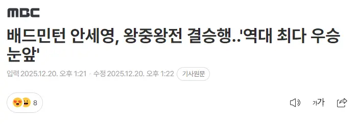 另一韩媒《MDC》更是直言:安洗莹行将成为羽毛球女子王中王,历史单赛季最多冠军近在当前,文中根底莫得把王祉怡当回事,直言安洗莹只差一场比赛就不错实现记录,以致莫得谈两边的战绩差距等。