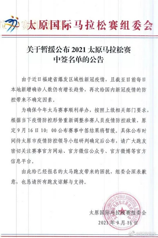 此外,9月16日,太马组委会还发布了一条暂缓抽签的公告,但好在没让跑友恭候太久,最终于9月18日公布了抽签。