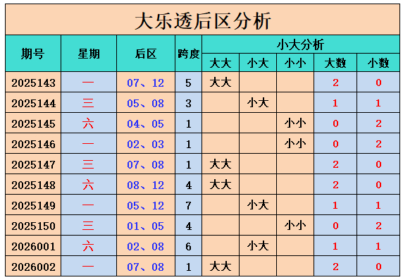 最近10期后区大小比为11:9,最近10期后区大大组合开出4期,小大组合开出3期,小小组合开出3期。上期开出大大组合,本期看好小大组合出现。