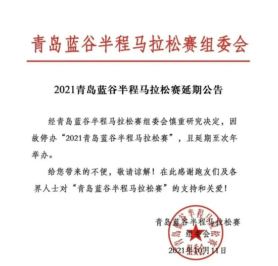 昨天,2021青岛海上马拉松和2021青岛蓝谷半程马拉松赛接踵发布展期公告,组委会示意本年因故停办,且展期至来岁举办。