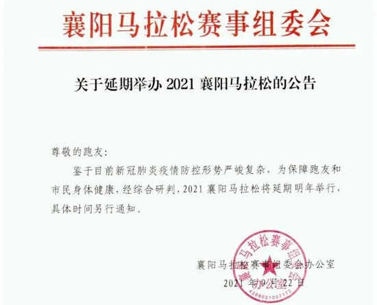 十一前,2021襄阳马拉松也秘书展期来岁举办。