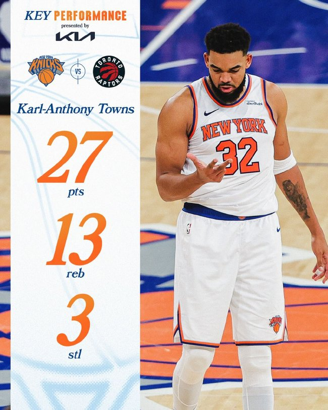 唐斯复出砍下27分13篮板征战尼克斯驱逐3连败,25胜13负稳居东部第三。