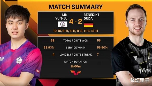 第六局,杜达5-0开局却连丢三分,林昀儒悲痛3-5,杜达肯求暂停。暂停总结,杜达保持住提升并以10-8领先拿到局点。林昀儒连救局点以13-11完成单局逆转,最终4-2淘汰杜达晋级男单8强。