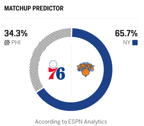 赛前,好意思媒ESPN瞻望本场比赛,尼克斯胜率65.7%,76东谈主胜率34.3%。
