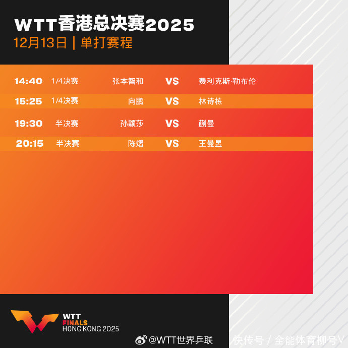 北京时辰12月13日音书,2025年WTT香港总决赛无间进行,CCTV5、CCTV5+直播比赛实况。其中,女子单打半决赛将献技两场中国德比战,孙颖莎对阵蒯曼(19:30),王曼昱迎战陈熠(20:15)。此前哈将无间两场男单1/4决赛的争夺,林诗栋对阵向鹏(15:25)、张本智和对阵小勒布伦(14:40)。